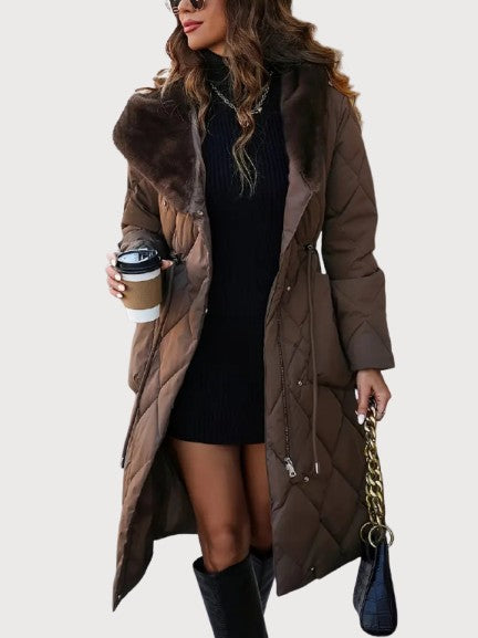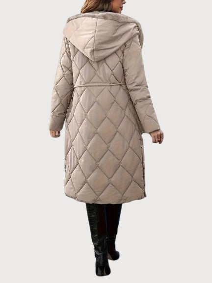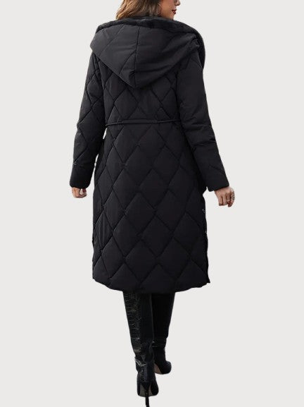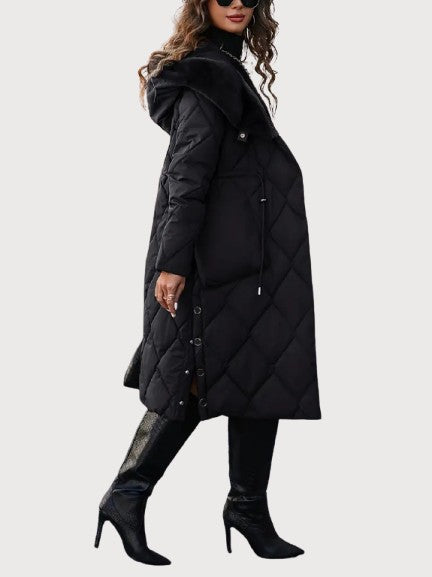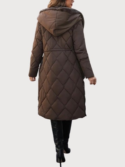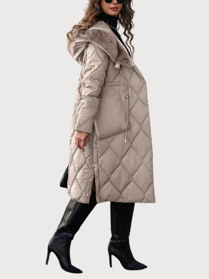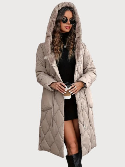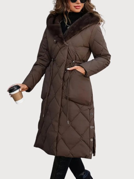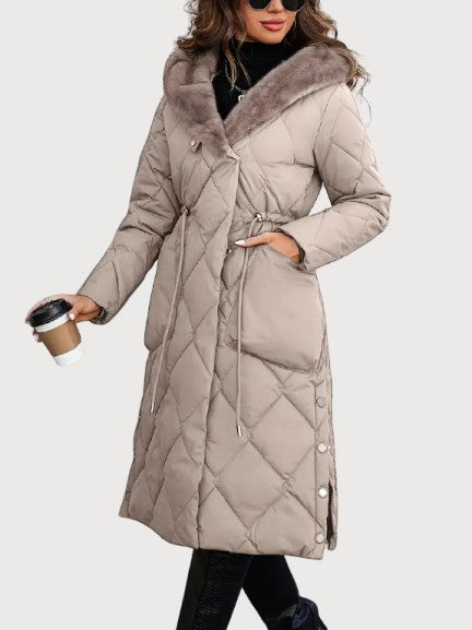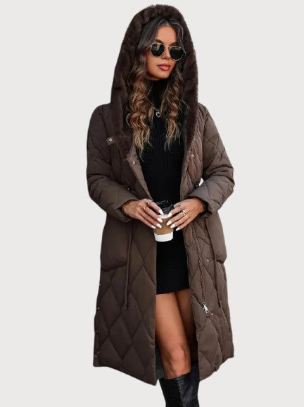 A long quilted coat with a soft fur-lined collar and an adjustable waist for shape. The dense padding and full-length design keep in warmth even on the coldest days. Its surface has a smooth, matte texture with a faint sheen under light. The hood adds comfort without breaking the coat’s clean line. Confident and composed — made for real winter weather and late evenings alike.